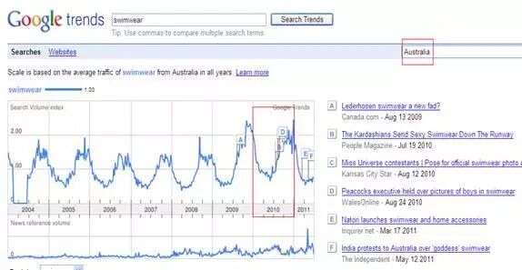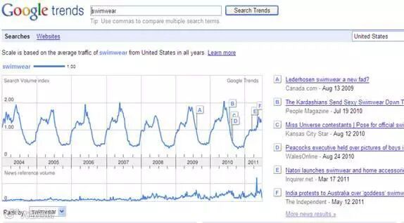 上图显示,在北半球的美国,5-7月为泳装搜索的高峰期,而在南半球的澳大利亚,9-1月为泳装高峰期。因此,对于美国市场的产品开发,我们要在3-4月就要完成,而对于澳大利亚市场的产品开发,则需要在8-9月内完成。如果不知道目标市场品类热度的周期规律,则必会错过市场高峰。