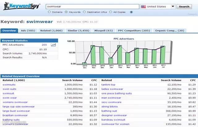 通过上图,我们可以得出结论:www.landsend.com这个网站以美国为主要目标市场,且在美国有较高知名度。结合KeywordSpy工具的分析,我们可以确定:www.landsend.com可以作为我们在美国乃至北美市场的泳装类别的参考网站,用于研究适合美国市场的泳装产品的品相及价格。