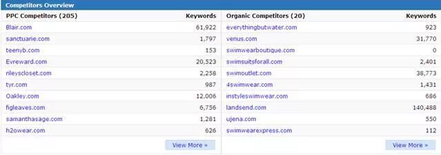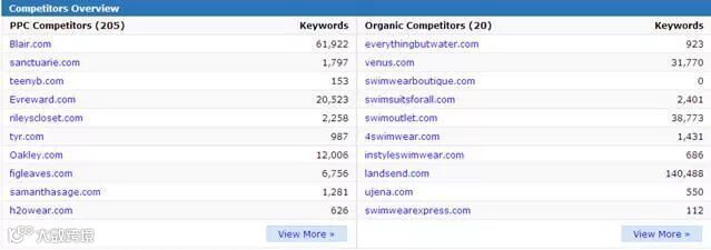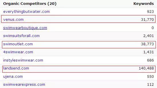 上图为Swimwear这个关键词所对应的主要竞争对手网站的站点列表,其中重点关注原始关键词较多的网站,如上图中的:
