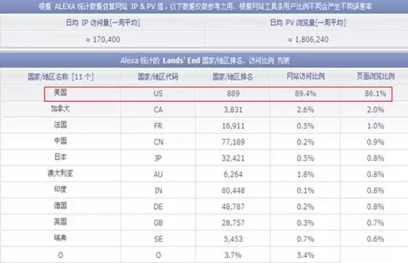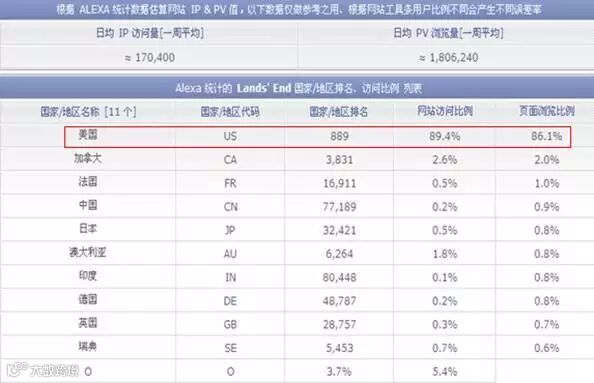 在查询结果页面,我们重点关注该landsend.com这个网站的日均ip流量(代表网站的整体知名度)及该网站在各个地区的排名(代表网站在各个地区的知名度):