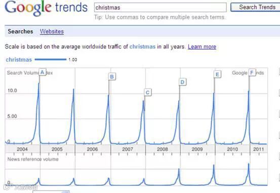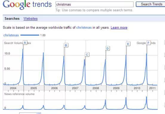 上图可见,圣诞节在一年之中只有一次最热的点,在每一年的9月份开始市场关注度逐渐提升,10月、11月高速增长,到12月底进入最高峰,之后迅速跌至低谷。如果能提前准备产品和相关的推广活动,则能从产品的整个热度周期占领市场,否则只能抓个圣诞节的尾巴。