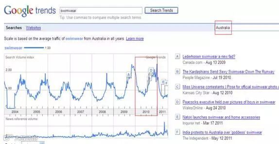 举例:以关键词泳装 Swimwear为例,选择国家分别为美国和澳大利亚,搜索结果如下: