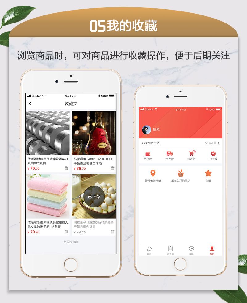5、我的收藏 用户在浏览商品时,可对商品进行收藏操作,便于后期的关注及采购。