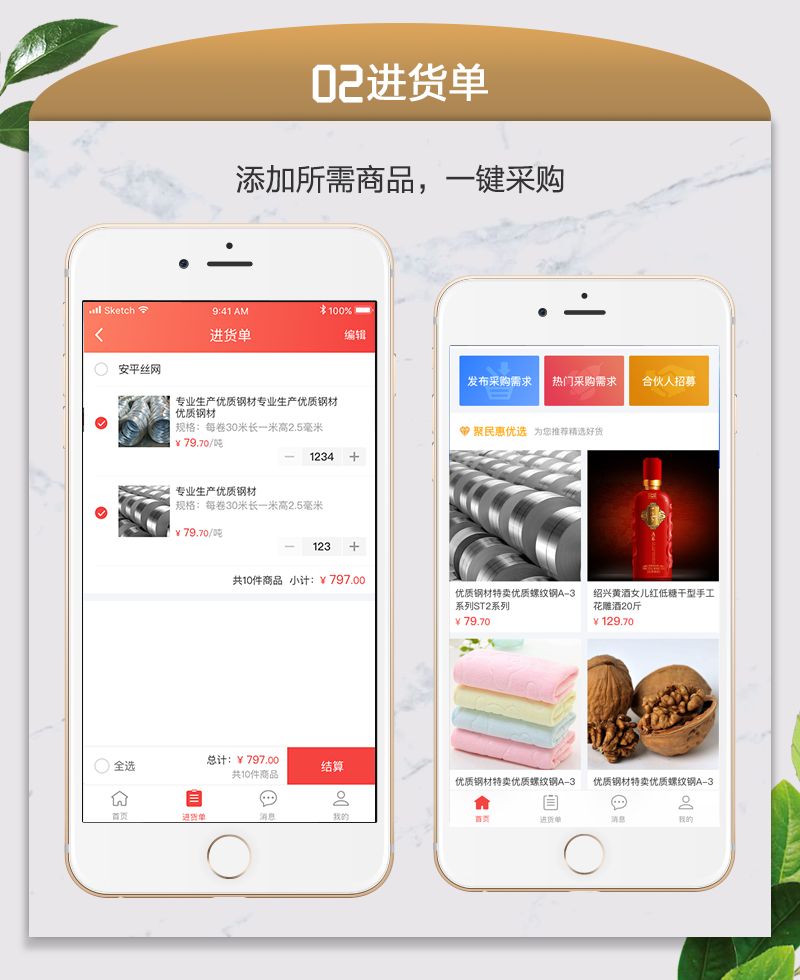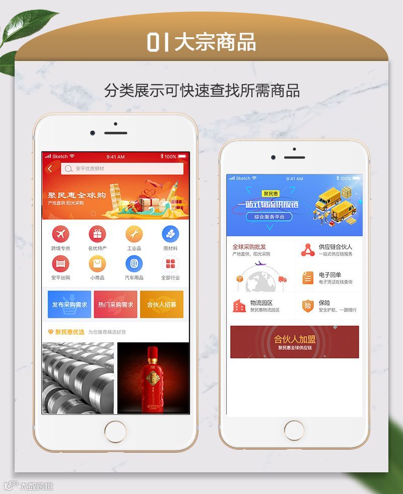 2月5日,聚民惠物流APP发布了2.3.0新版本。作为春节前的最后一次更新,新版本在APP的供应链采购平台版块新增了大宗商品分类展示、进货单、采购需求、我的订单、我的收藏五大新功能。