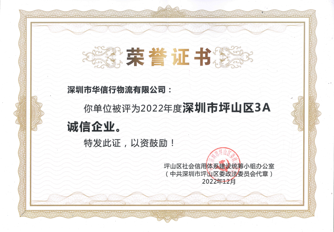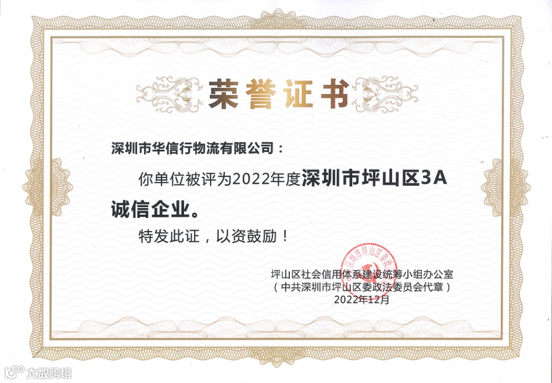 深圳市华信行物流有限公司荣获“深圳市坪山区3A诚信企业”