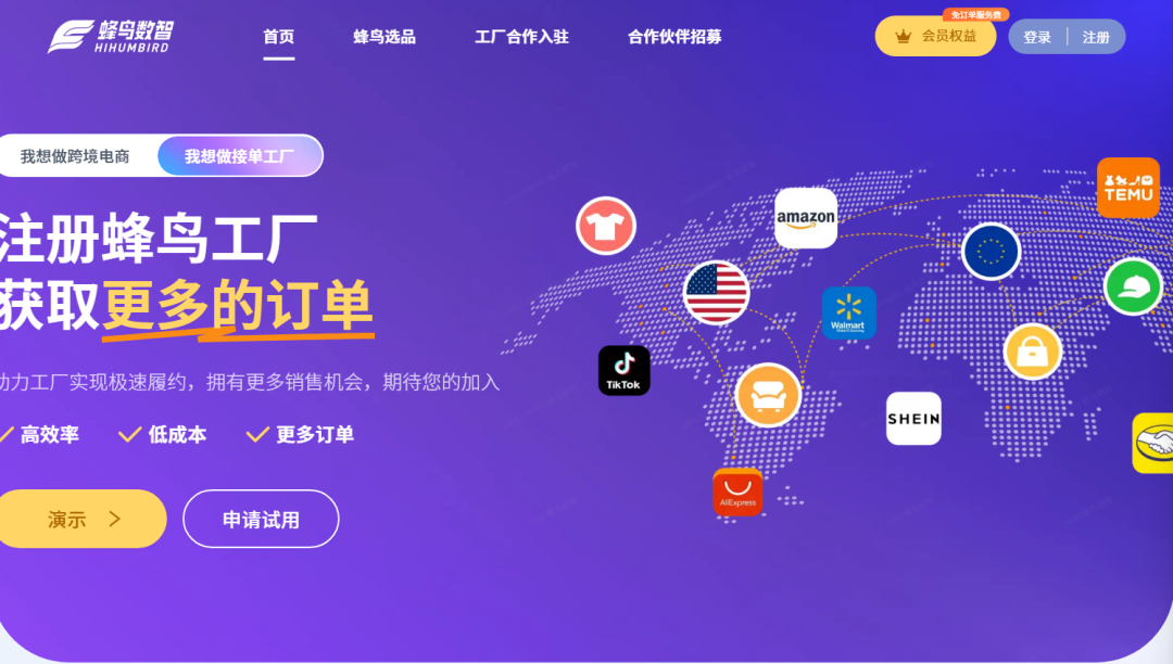 传统工厂订单存在淡旺季波动,“产能闲置是常态、订单旺季吃不下” 的矛盾长期制约发展。蜂鸟数智整合全球 10 万 + 跨境卖家资源,构建动态全球订单池,覆盖欧美、东南亚等核心消费市场。工厂可一键接入蜂鸟订单池,闲置产能能精准匹配全球订单需求,实现 “旺季满产、淡季不闲”,让设备利用率大幅提升,彻底告别 “订单断档就停工” 的产能浪费困境。蜂鸟数智还开创了行业0订单服务费合作模式,直接减免工厂接单成本,提高工厂的利润率。