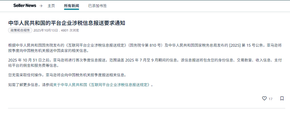 2025年10月《互联网平台企业涉税信息报送规定》正式落地,明确要求亚马逊等境外电商平台按季度向中国税务机关报送卖家身份信息、交易数据等关键资料。