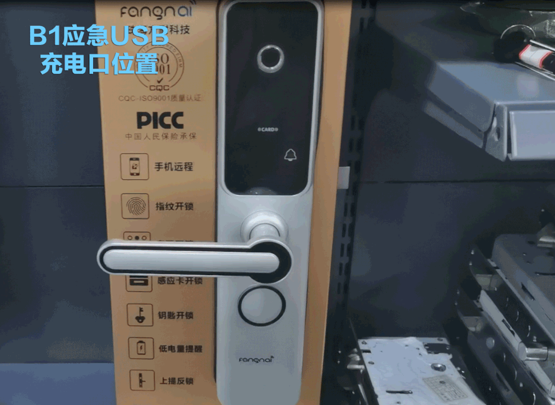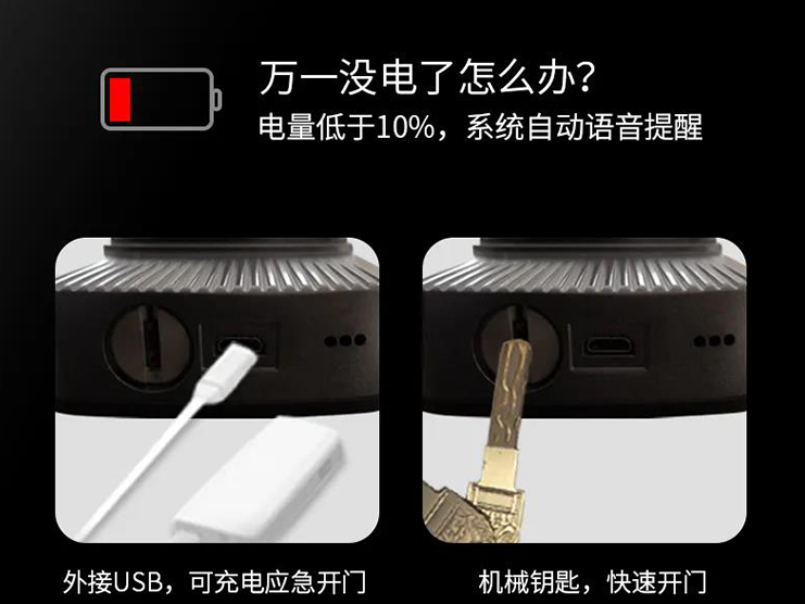 智能锁的应急USB充电口,不是跟钥匙孔在一起,就是在面板底部。没电的时候,可以通过它应急供电或者使用钥匙开锁。