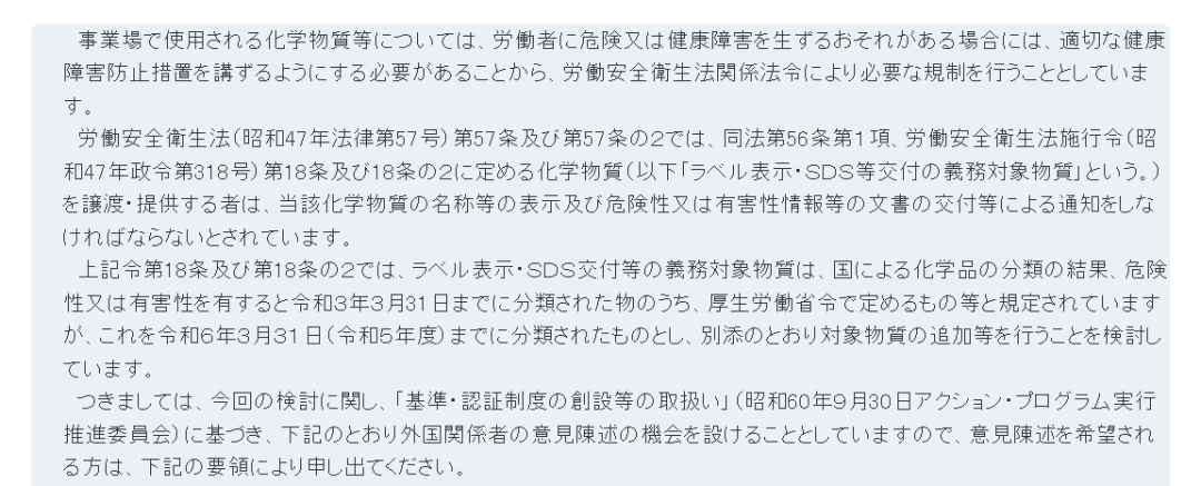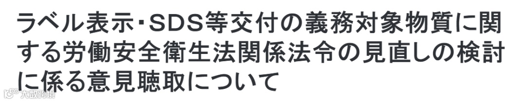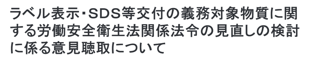 日本厚生劳动省于今年9月20日开启对《劳动安全卫生法》(原文为《労働安全衛生法》)中有关标签对象物质、SDS 等相关法律法规的更改和修订的公开咨询。