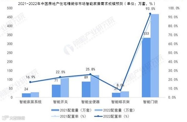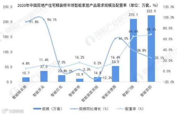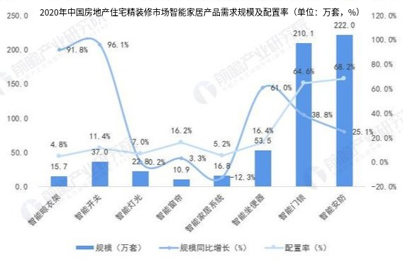 从智能家居前装市场来看,目前房地产精装修市场智能家居的主流产品包括:智能锁、智能安防、智能坐便器、智能家居系统、智能开关、智能窗帘、智能灯光、智能晾衣架等。作为智能家居的入门级产品,2020年智能锁及智能安防配套量均超200万套。其中智能锁配套规模达210.1万套,配置率为64.6%;智能安防配套规模达222万套,配置率为68.2%。智能门锁和智能安防设备在精装修市场的普及度明显较高。