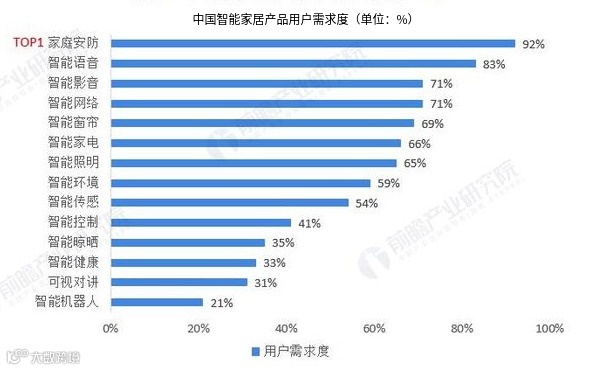 安防类智能家居设备产品主要包括智能门锁、智能猫眼、智能门铃、智能监控设备、门磁传感器、红外报警器等。从中国智能家居产品用户需求度情况来看,家庭安防是用户需求度最高的智能家居产品,需求度高达92%。