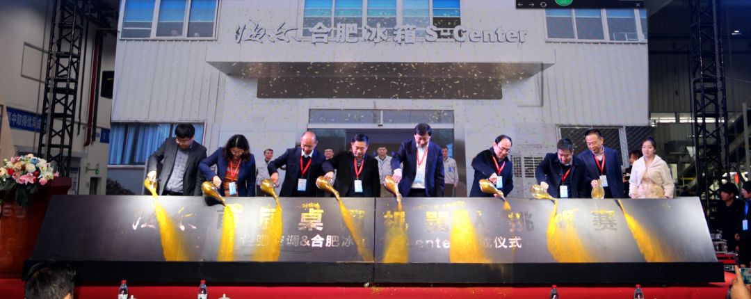 在欢庆热烈的音乐下,莅临的领导们齐登舞台中央,手握鎏金烫沙共同见证海尔合肥空调&合肥冰箱S-center的落成。他们分别是: