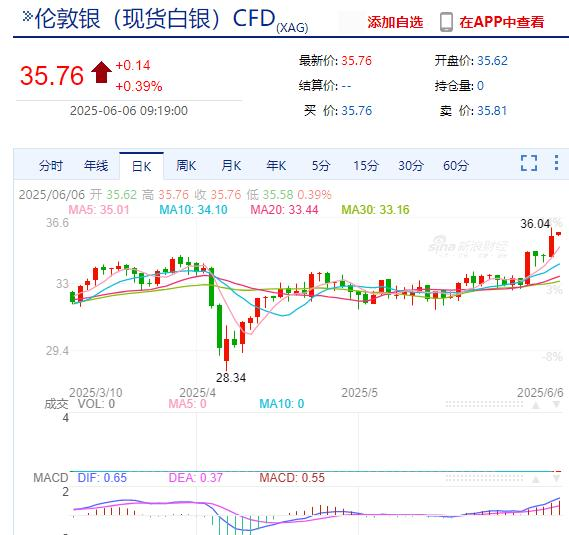 据《每日经济新闻》报道,6月5日,现货白银价格大幅上涨4.5%,创下自2012年2月以来的新高,收盘报36.06美元/盎司。
