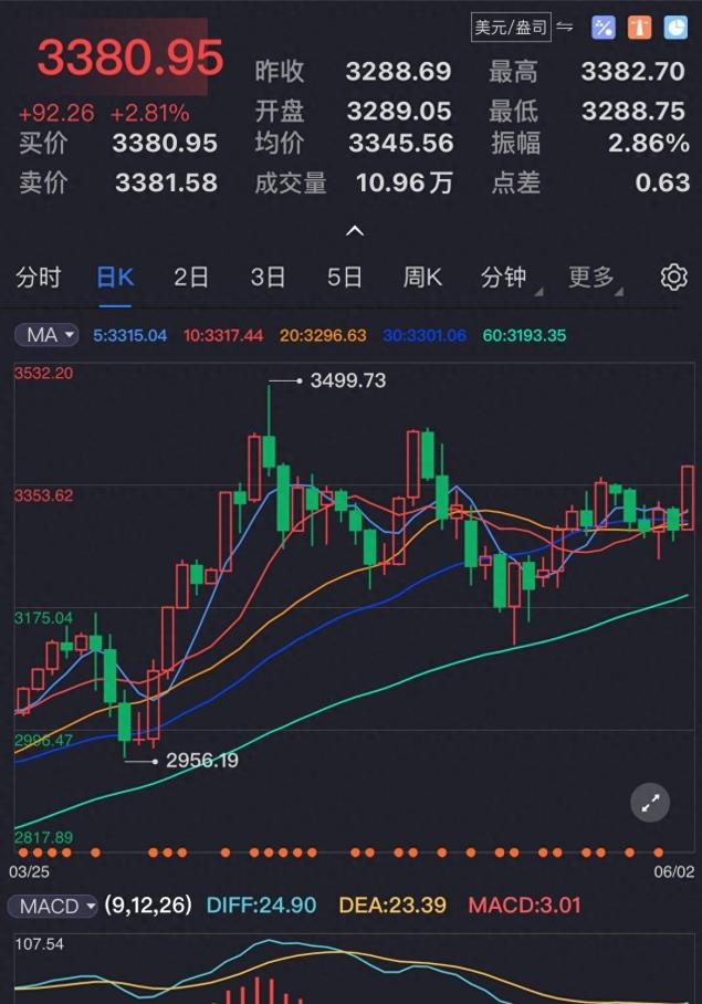 其中,最令人震惊的是,当属6月3日清晨,现货黄金价格单日暴涨逾90美元,涨幅高达2.81%,强势突破3380美元/盎司关口!