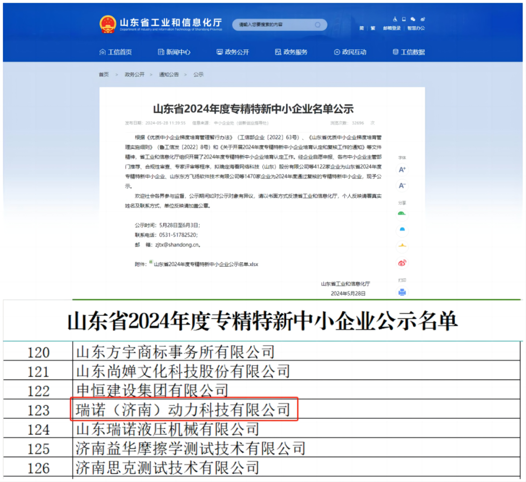 2024年5月28日,山东省工业和信息化厅公示了《山东省2024年度专精特新中小企业名单》,瑞诺(济南)动力科技有限公司凭借在再制造行业的专业化、技术创新力和服务精细化,从众多参选企业中脱颖而出,获得“山东省2024年度专精特新中小企业”荣誉称号。
