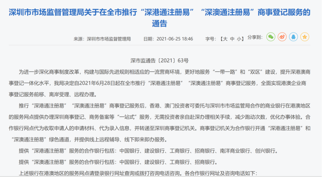 深圳市市场监督管理局在2021年6月25日发布了一则《深圳市市场监督管理局关于在全市推行“深港通注册易”、深澳通注册易”商事登记服务的通告》,这就意味着大湾区的建设推进了更大一步。我们从港澳居民投资注册深圳公司需要公证的状态,一步跃进同本区居民一样的操作流程,更大程度上的完善及简化了商事登记的流程。今天鼎诺小编为大家整理了关于最新港澳居民在深圳注册公司的相关事宜,最大程度的让大家对商事登记服务有一个全面的了解。