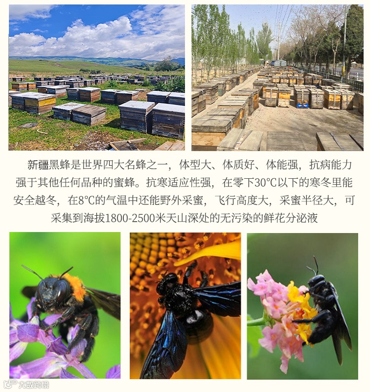 优质蜜源来自优良蜂种类~新疆黑蜂是世界四大名蜂之一,体型大、体质好、体能强,抗 bing 能力强于其他任何品种的蜜蜂。