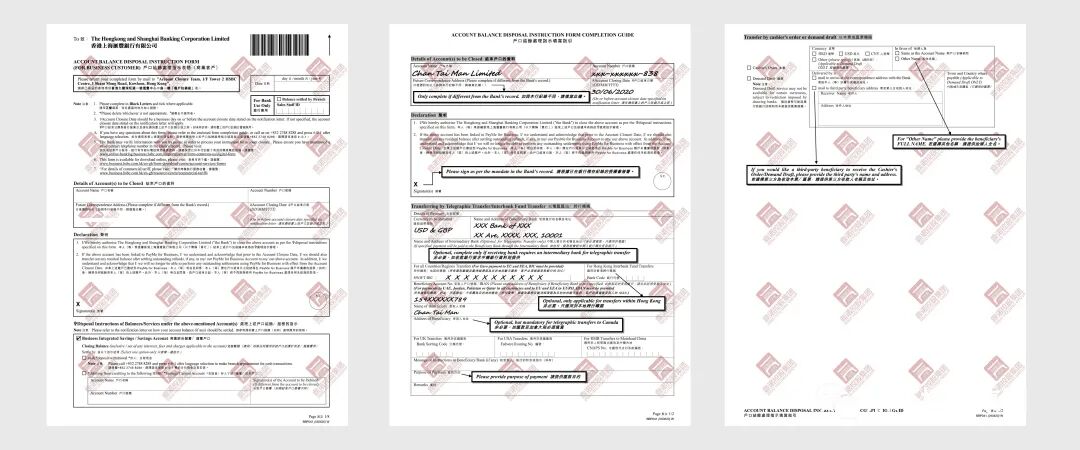 如香港汇丰银行帐户被关闭,可以直接填写《ACCOUNT BALANCE DISPOSAL INSTRUCTION FORM(FOR BUSINESS CUSTOMER)户口结余处理指示表格(商业客户),填写可接受款项帐户信息,连同《帐户关闭董事决议》一并寄到香港汇丰银行客服部。正常余额约在一周左右入帐到收款帐户。其他银行暂时未开通此服务。
