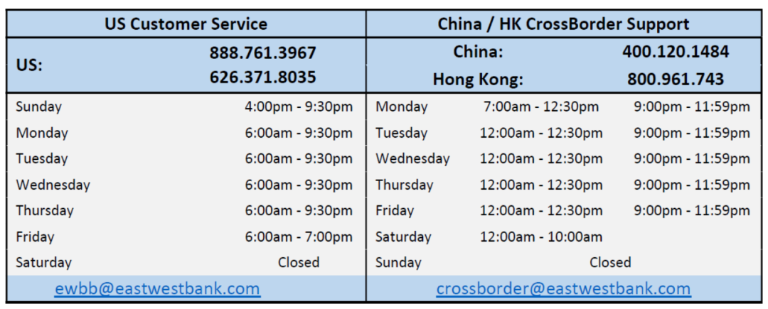 华美银行还有以下中国上班时间的中英文客服热线, 特别为我们中国大陆/香港/台湾的客户服务。