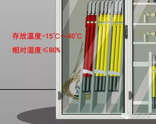 (2)存放安全用具的地点,要有防止受潮、防酸、防碱、防油的措施,最好采用防湿的工具橱存放安全工具。