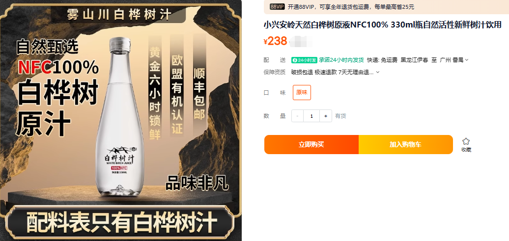 这么好的雾山川白桦树汁怎么能不入手呢?小编替大家看过了,在某宝随便一瓶330ml的就要238元一瓶!