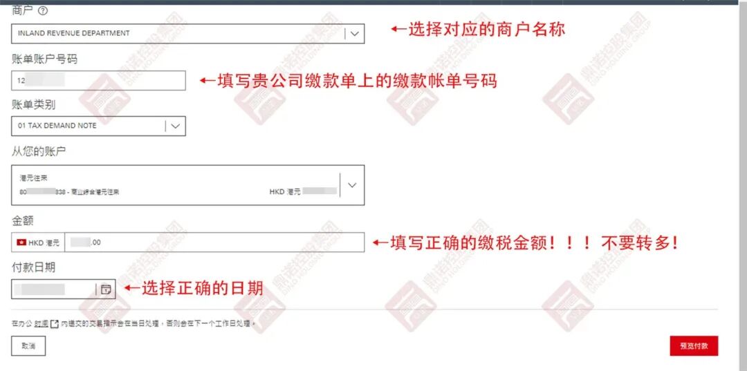 以上是关于香港公司针对于香港税务局缴款提醒及缴款实际操作流程做了一个指引,如果对香港税务局缴交税款有任何疑问,均可联络鼎诺控股客服经理。另外,对于香港公司税务方面有任何疑问,亦可联络我们。鼎诺控股集团除开香港公司管理业务外,还拥有:离岸公司注册、境内外各大银行开户、境内外企业审计报税、知识产权代理……等相关业务,欢迎客户及代理咨询洽谈合作事宜。