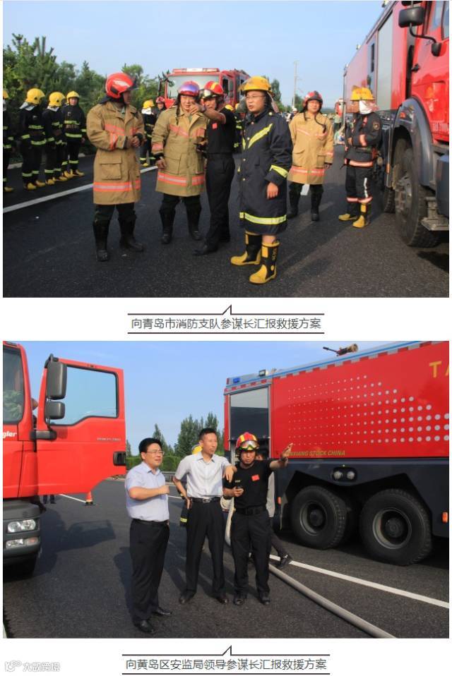 事故发生后,黄岛区政府立即启动区应急预案,急调青岛炼化应急救援队前往现场处置,青岛炼化应急救援队接到指令后,救援队队长赵文政立即带领一辆多功能抢险救援车、一辆18米高喷车和11名队员赶赴现场救援。