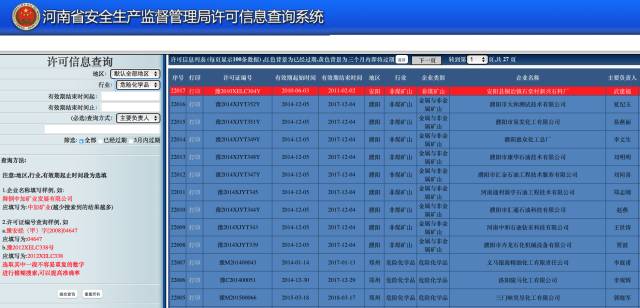 湖南、内蒙古等安监局工作人员称,经营许可证由地市级安监局核发并公开信息,省局不直接掌握数据。南方周末记者登录长沙、株洲、岳阳、包头、呼伦贝尔、鄂尔多斯等6市安监局网站,只在长沙市网站上查询到按月公布的经营许可证信息,最近更新到2015年5月。