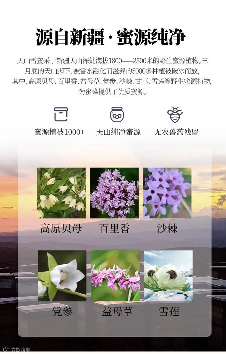 好环境好产地才能造出好雪蜜!这款新疆天山雪蜜可是纯净蜜源,来自天山海拔两千米处,雪水灌溉上百种野生蜜源植物。