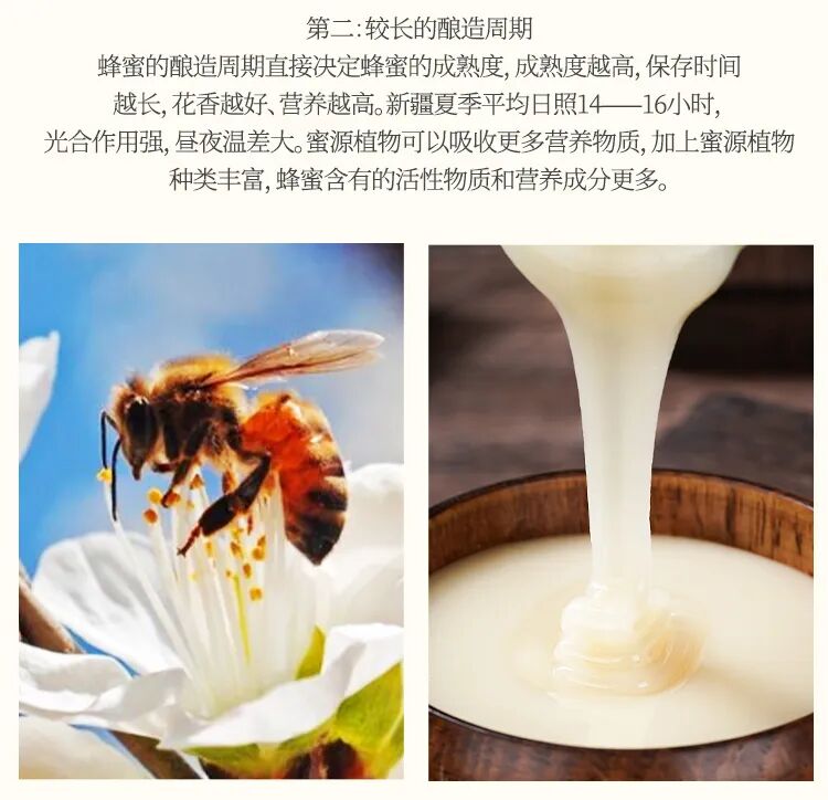 新疆 16 小时超长日照,赋予蜂蜜更充足的酿造时间,营养物质、活性酶加倍积累,美味与健康兼得!