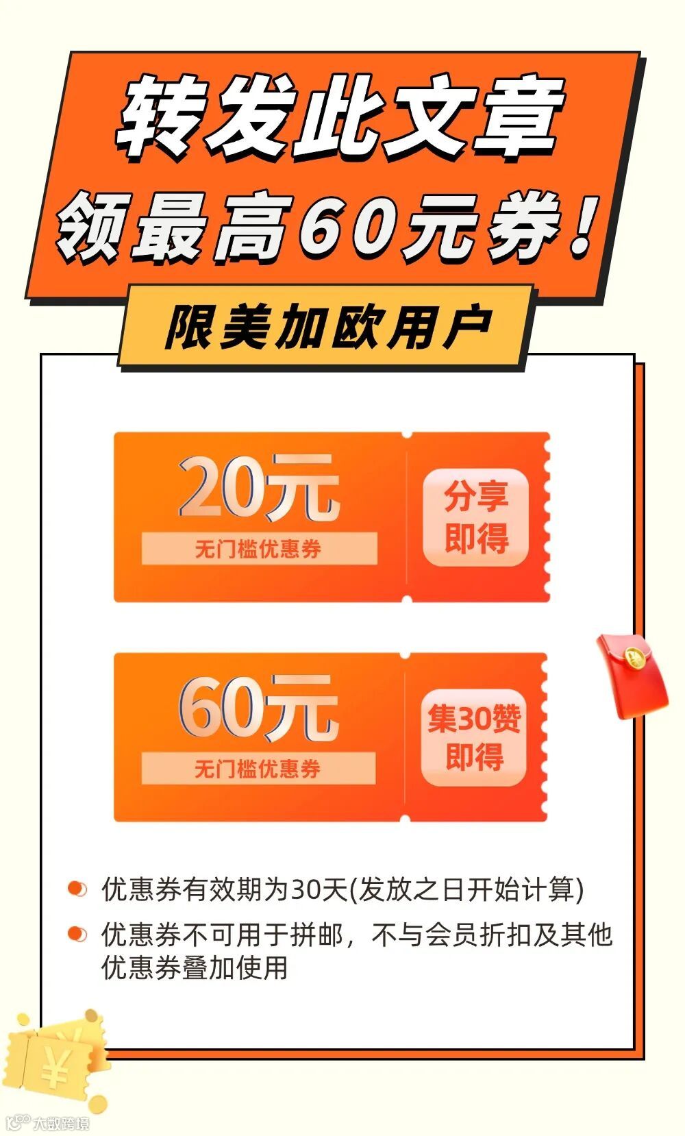 • 转发活动仅限美欧加新老用户参与,同一收件人只能参与1次分享,有且只能兑换1张优惠券(20元无门槛或60元无门槛)。重复分享不可多次兑换;