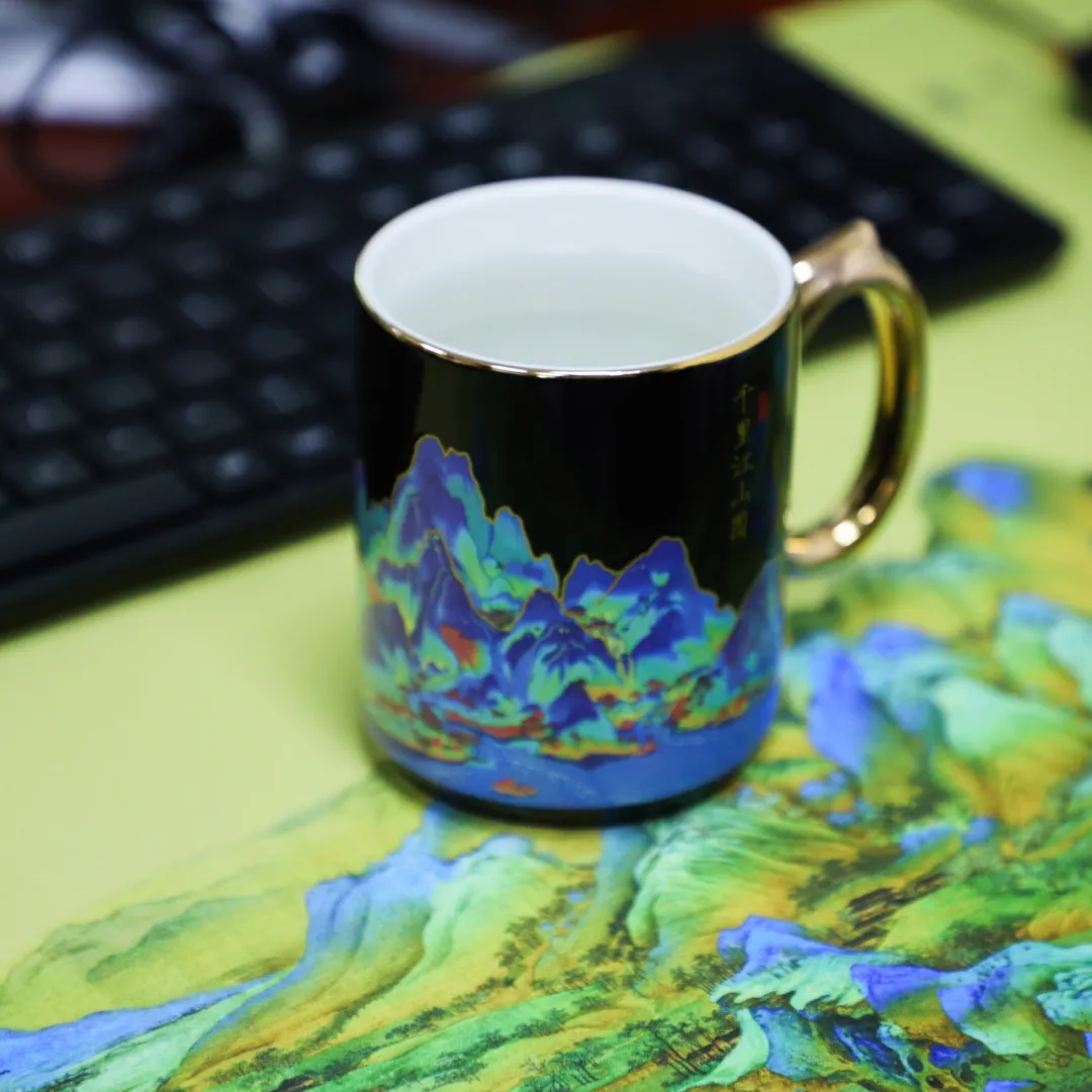 杯身变色后的图案,是从12米长《千里江山图》中选取的一段,经过创新后,层次鲜明、色泽饱满,如画中盛景,太美了。