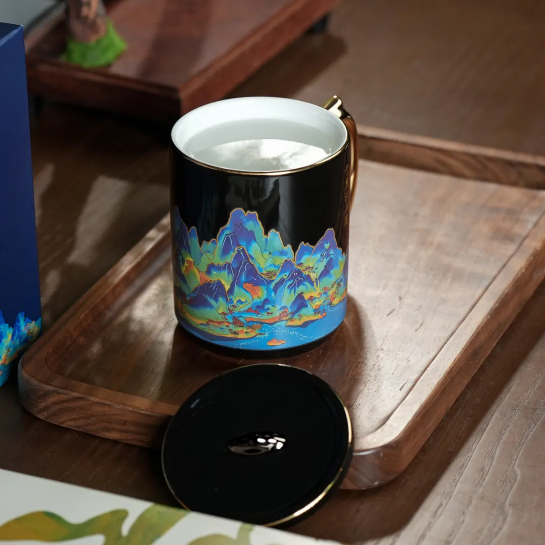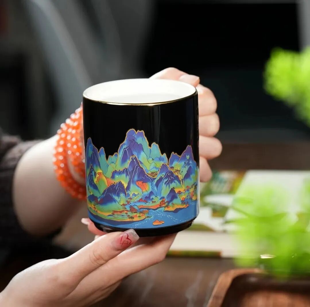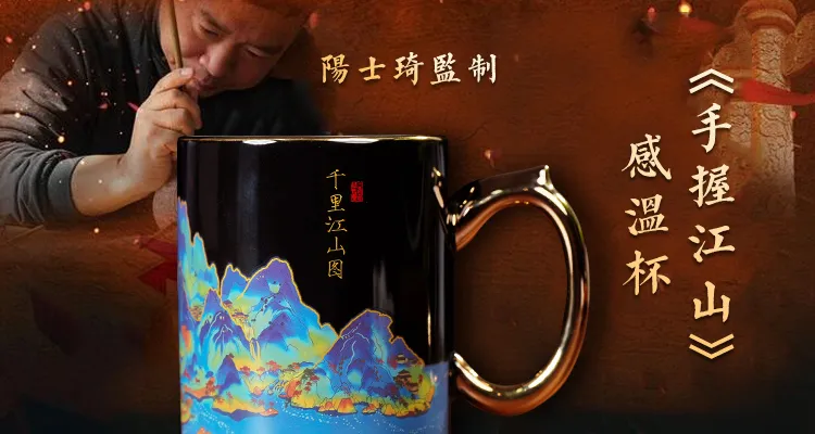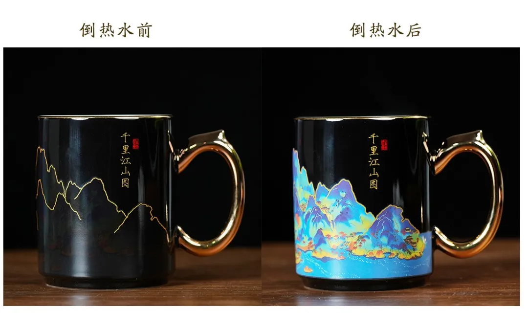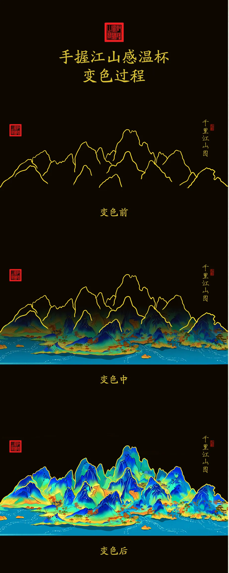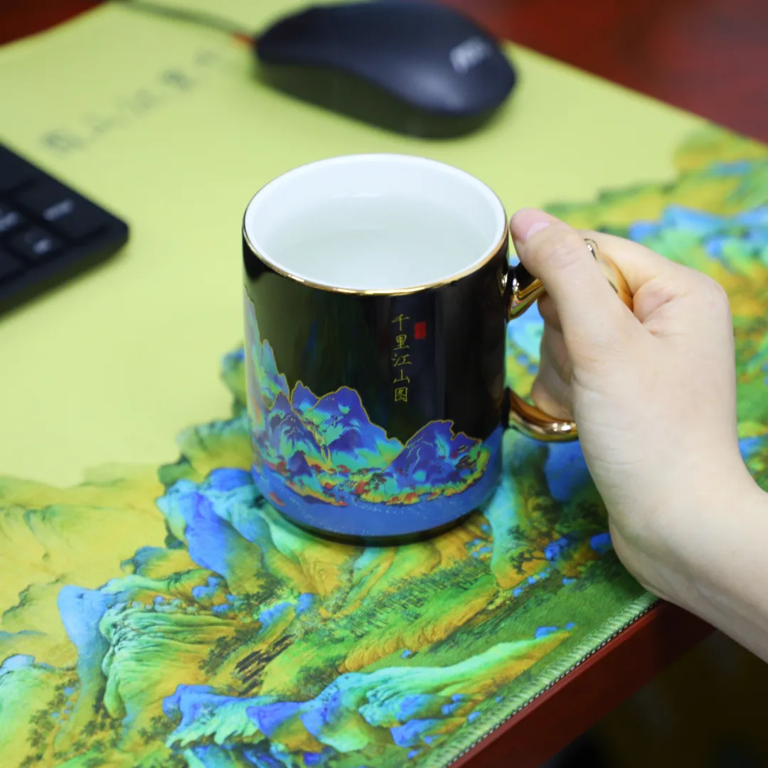 当遇热60℃以上,杯身图案就会渐渐晕开,呈现出《千里江山图》的惊艳之美。