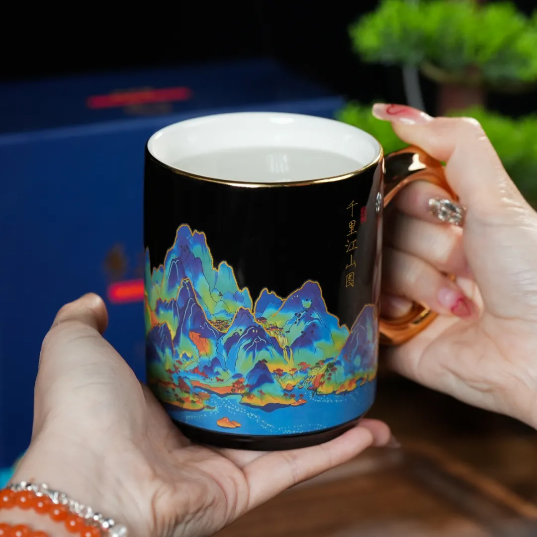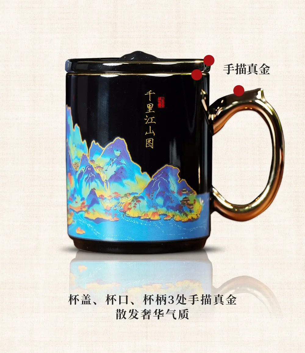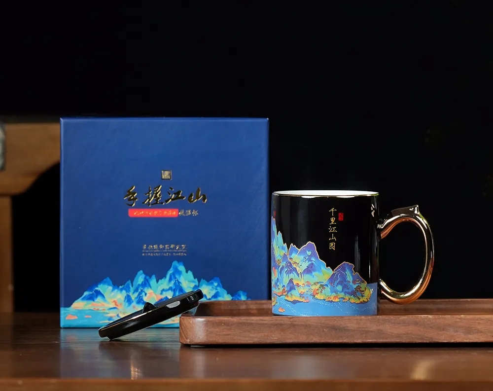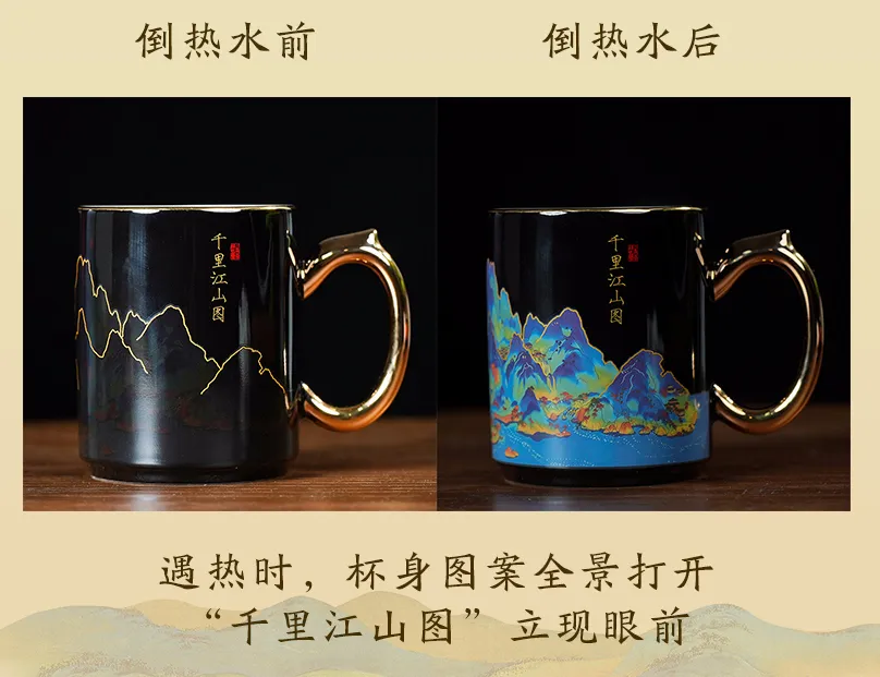 2、暗藏局部千里江山图,遇热即显,350ml大容量,精美礼盒包装,宜礼宜藏。