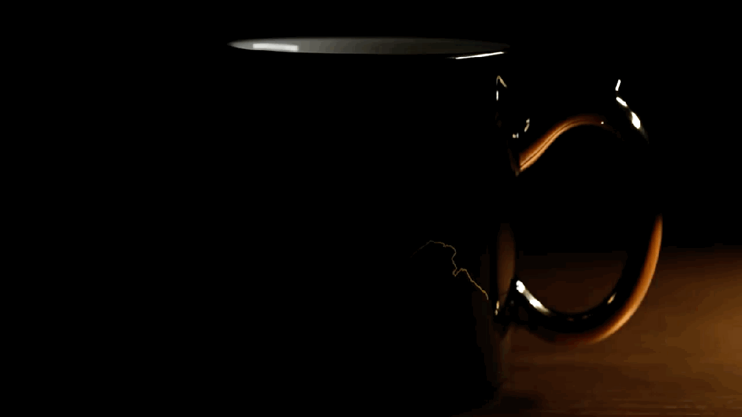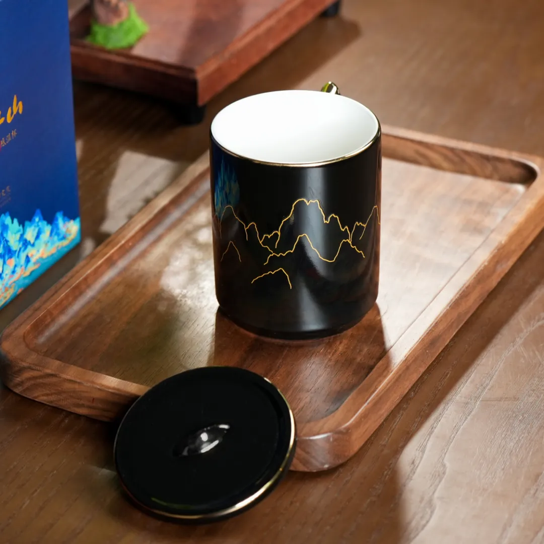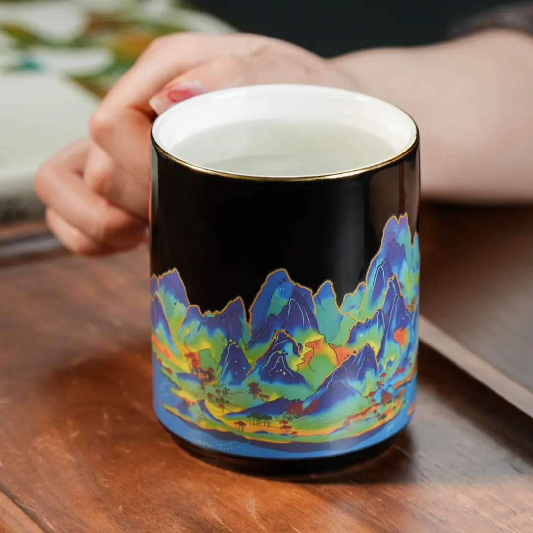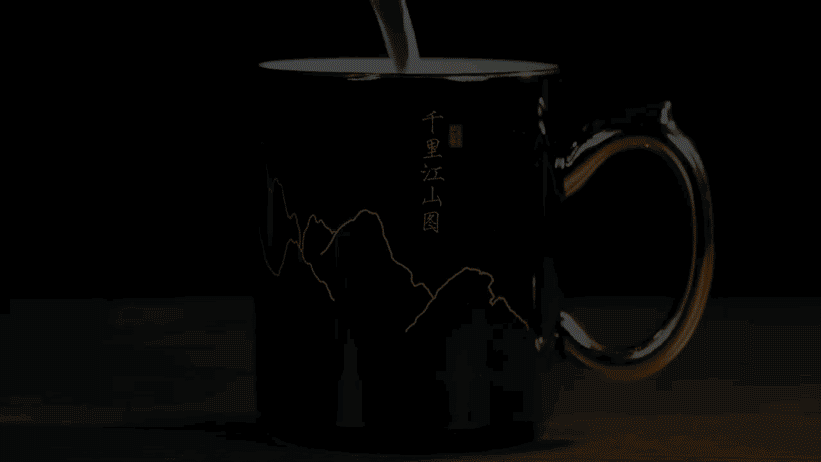 变色前,通体黑色,釉色浑厚,杯子上只有数根金色流畅的线条,乃高山的轮廓,散发内敛奢华气质。