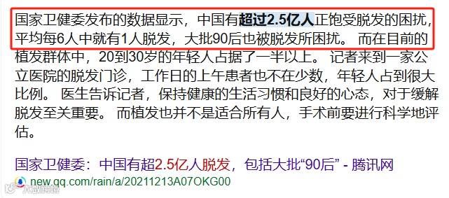 据最新调查显示,我国脱发人数已超过2.5亿,其中30岁前的人群掉发比例高达84%,这一数字比上一代人提前了整整 20 年!!