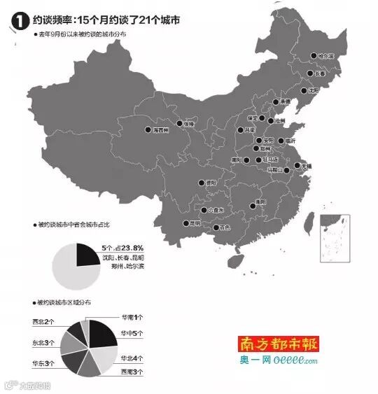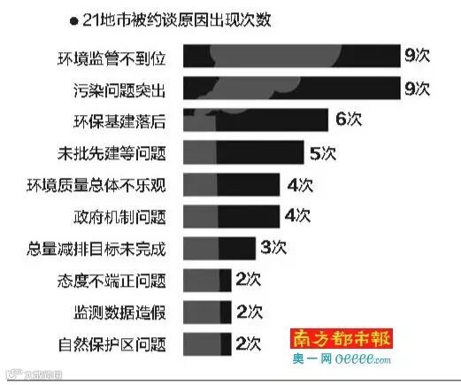 记者统计,自去年9月份以来,15个月里,环保部约谈了21个城市(不包括企业和各省的林业等部门),平均每21天约谈一个城市。其中,河南、河北最多,分别有4个和3个城市被约谈。