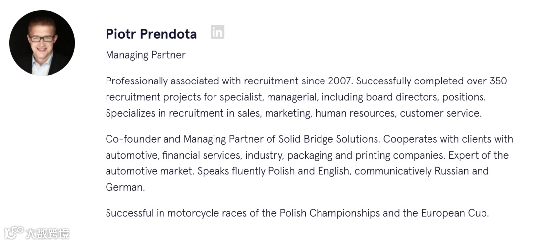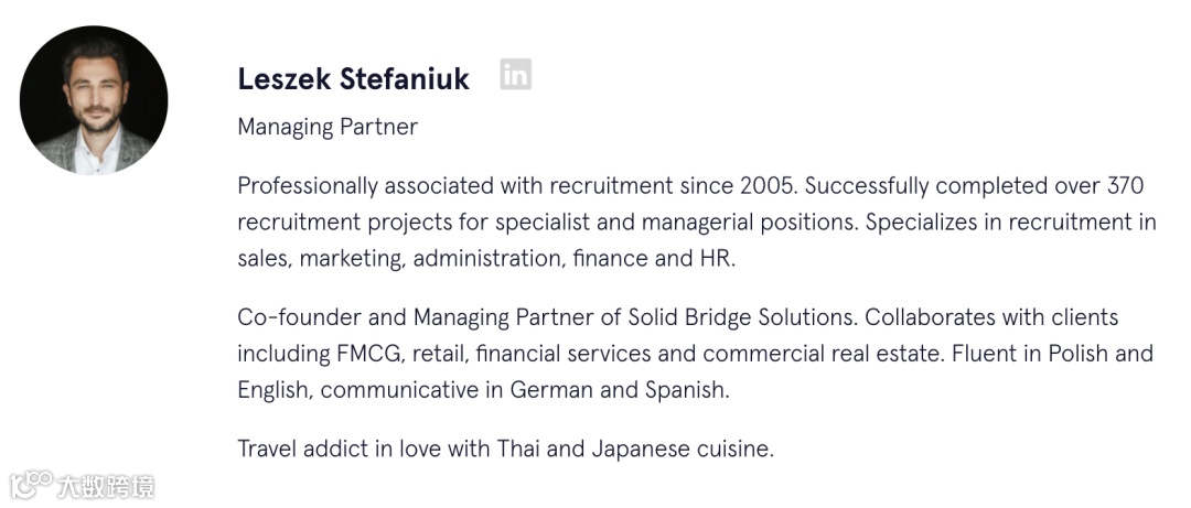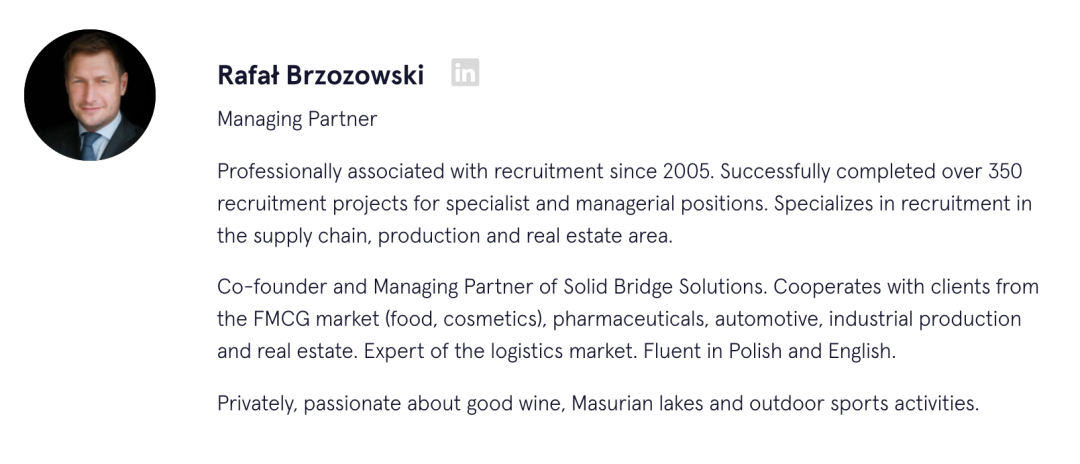 Talentor Poland-Solid Bridge由一群在招聘咨询方面拥有多年专业经验的顾问创立,他们结合多年招聘经验和知识,为客户提供高质量的招聘服务和最高效的高管寻访解决方案。