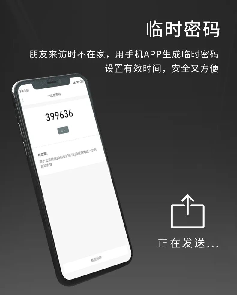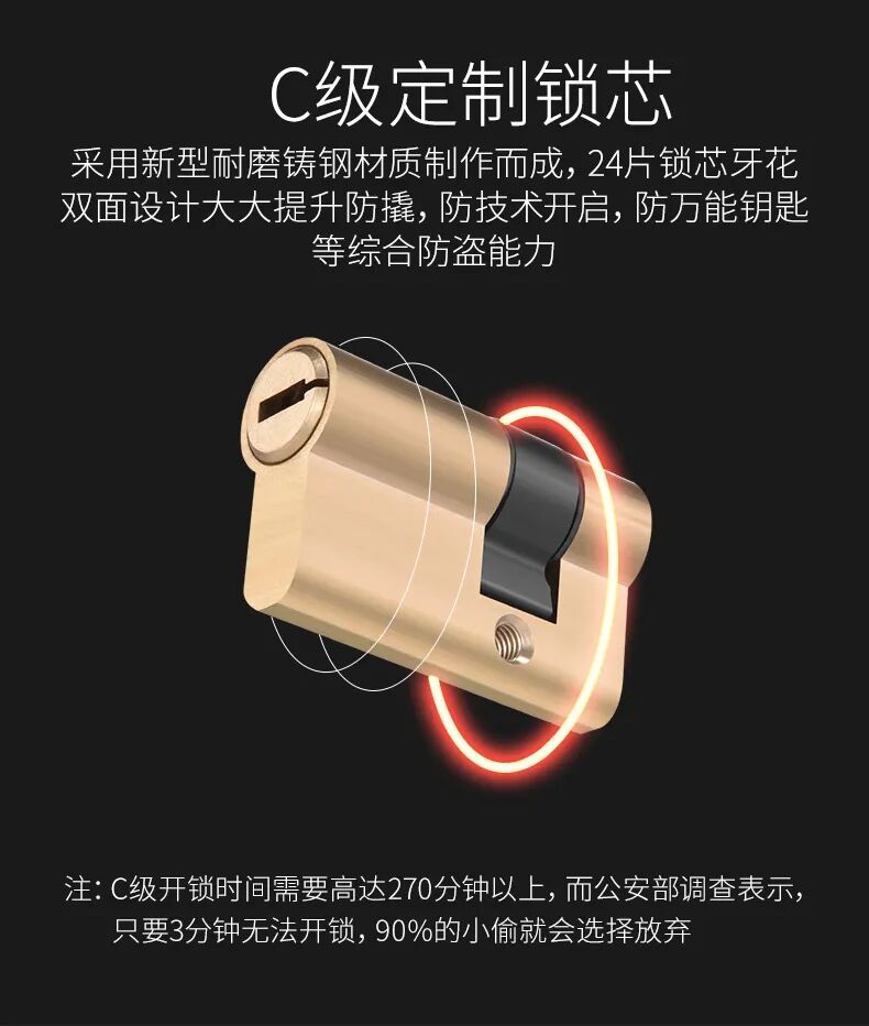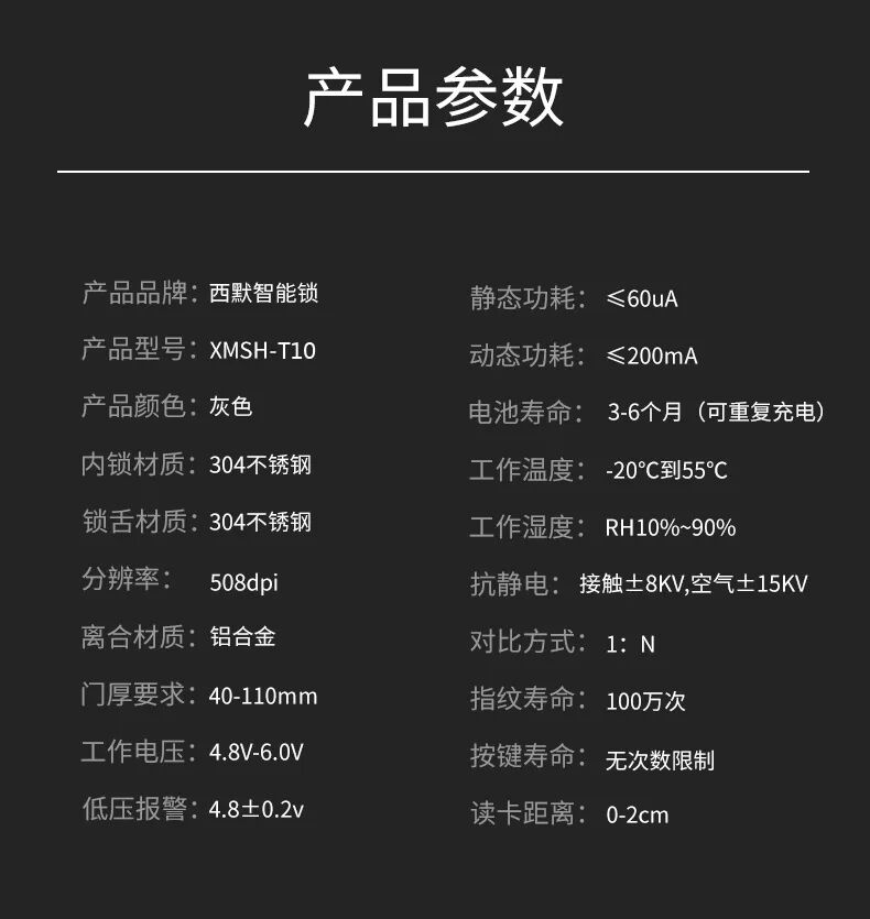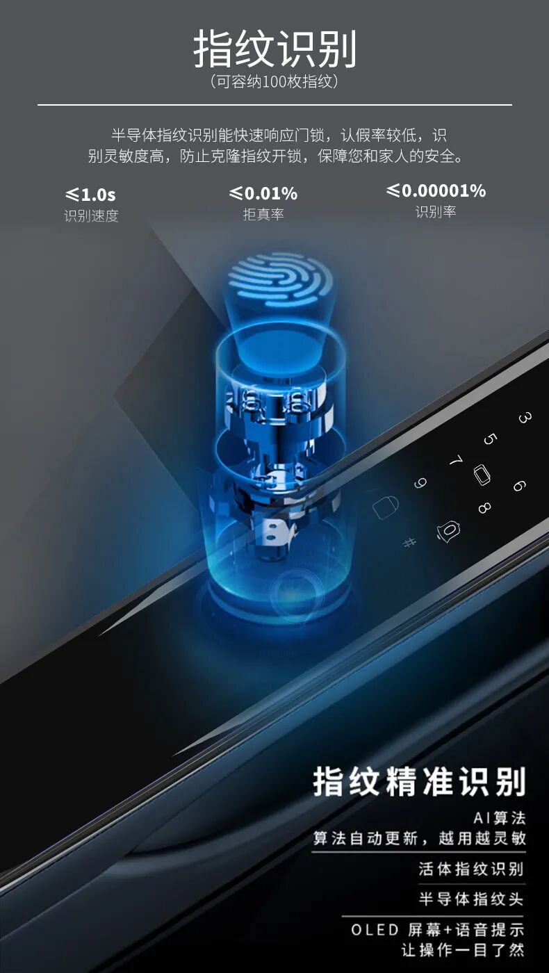 值得一提的是,T10的指纹解锁采用半导体指纹识别技术,此技术可快速响应门锁,识别灵敏度高,认假率低,防止克隆指纹开锁的事情发生,时刻保障您和家人的安全。