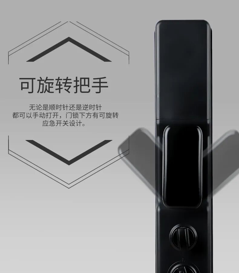西默T10全自动智能锁一握即开,享受智慧联动的生活模式。与此同时,贴心设计了可旋转把手,无论是逆时针还是顺时针都可以手动打开,为你的生活增添一分色彩。