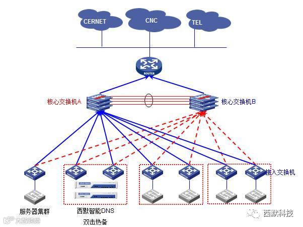 1.利用西默智能DNS的单个域名对应多个IP功能,统一用户对学院站点的访问(内外网用户和不同运营商的访问者使用同一域名进行访问),并通过智能解析功能,到速度最优的服务器IP进行访问;