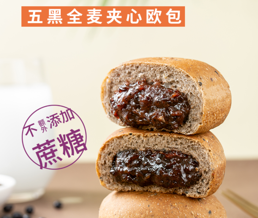 而且每 100g 五黑紫米欧包蔗糖含量甚至 ≤ 1g,是健身党的代餐好选择。