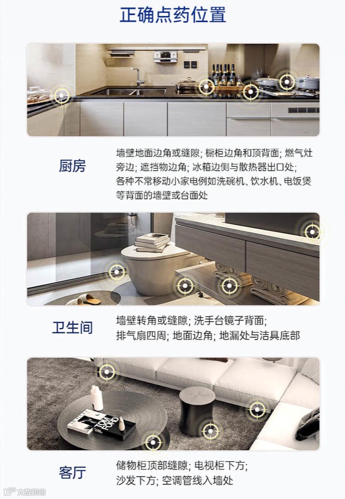 像厨房这种蟑螂重灾区,用的时候可以密集点,像储物柜角、洗手盆下,电器背后,水槽缝隙都是蟑螂的栖息地,最好通通点上。