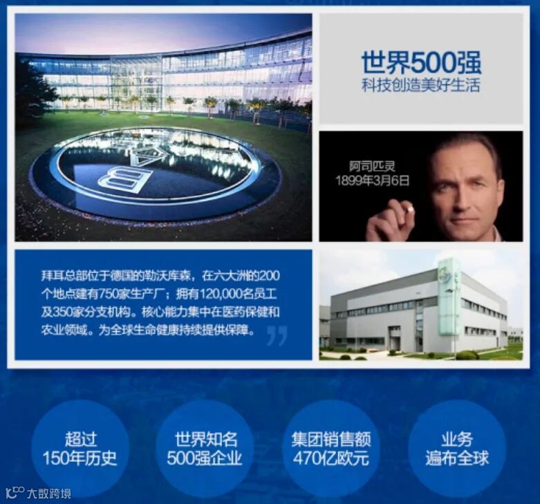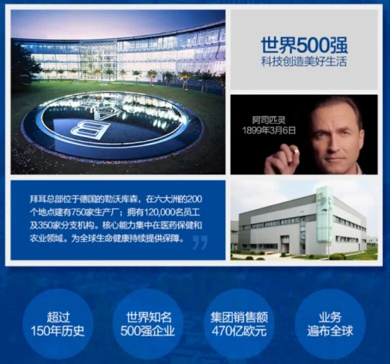 拜耳创建于1863年,总部位于德国勒沃库森,至今已拥有超过150年的历史,知名的世界500强企业。