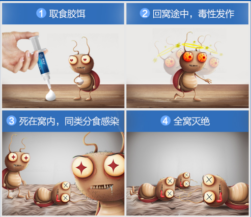 它的巧妙之处就在于,吃了胶饵的蟑螂并不会立即死亡,它会在回窝的过程中慢慢毒发,最后死在窝里。