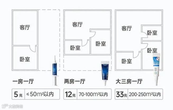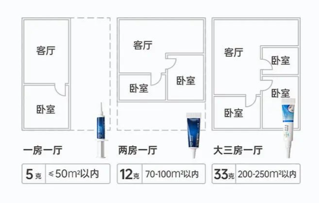 用量推荐:一支12g装就能覆盖90㎡,普通家庭基本一支搞定。租房独居面积小一点的,用5g/支的就行了,能覆盖40㎡。