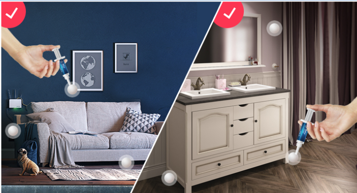 只要用点涂方式,挤出米粒大小,以每隔1~2米的距离, 滴在沙发底、马桶缝,茶几、水槽、柜子的角落处即可。