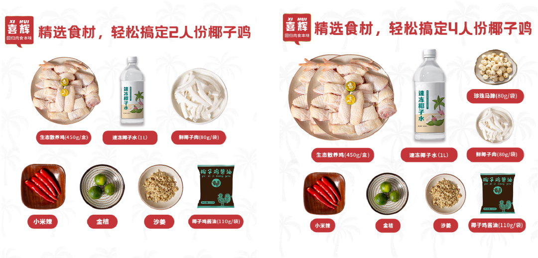 而我们的喜辉椰子鸡套餐4人份里面满满当当有 900g 精选鸡肉、1L 海南文昌当地椰子水、椰肉、珍珠马蹄等等,不仅省去了挑选和购买食材的时间和精力,还极具性价比。