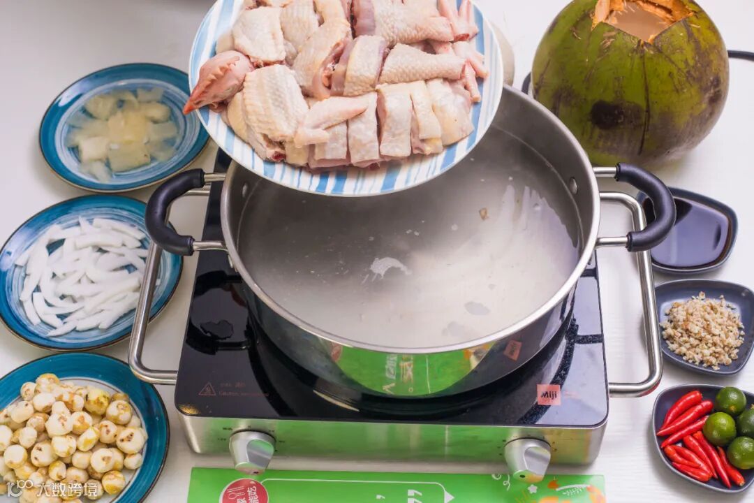 足足 1L 的清甜椰子水作汤底,完全不用再加入一滴水,把细嫩紧致的走地鸡放入锅中,等待15分钟后就可以开吃。