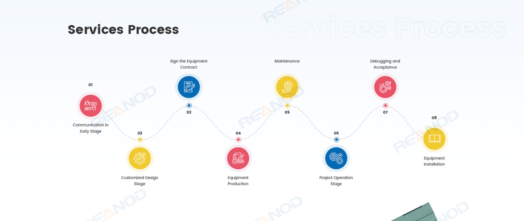 比如在这个“服务流程”模块,8个服务流程采用8个可爱的彩色圆形展示,非常符合游乐设施的调性。
